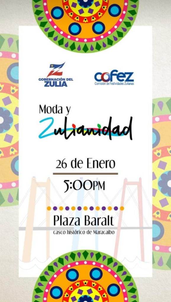La directora ejecutiva de la Comisión de Festividades Zulianas, Kerelia Barón, anunció hoy a través de un programa radial que este jueves, 26 de enero, a partir de las 5:00 de la tarde, está previsto un desfile denominado “Moda y Zulianidad”, que tendrá lugar en la Plaza Baralt, con la participación de representantes de las cinco etnias del Zulia.