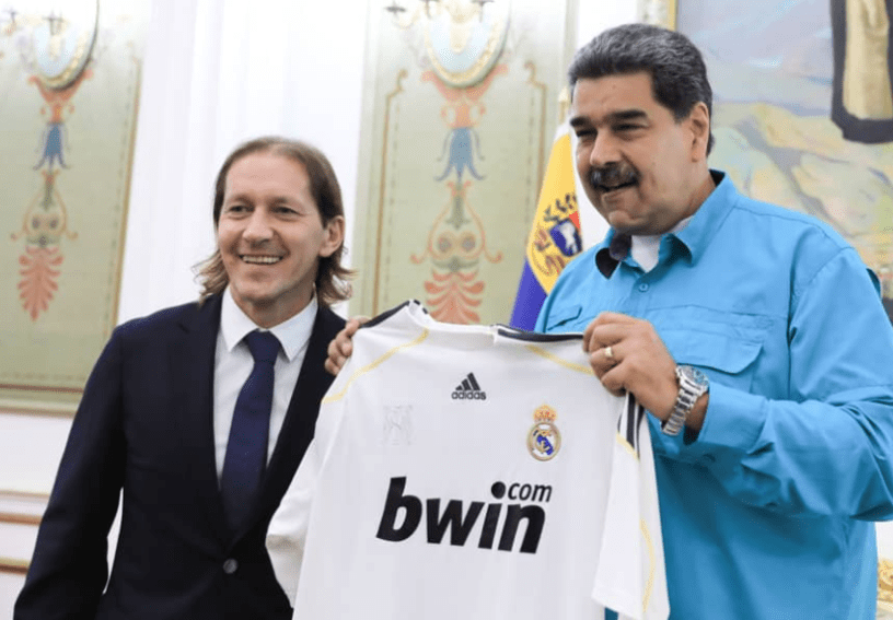 Los exfutbolistas Michel Salgado y David Trezeguet le entregaron camisetas de fútbol del Real Madrid y de la selección de Francia a Nicolás Maduro, en un encuentro que se llevó a cabo en el palacio de Miraflores este viernes.