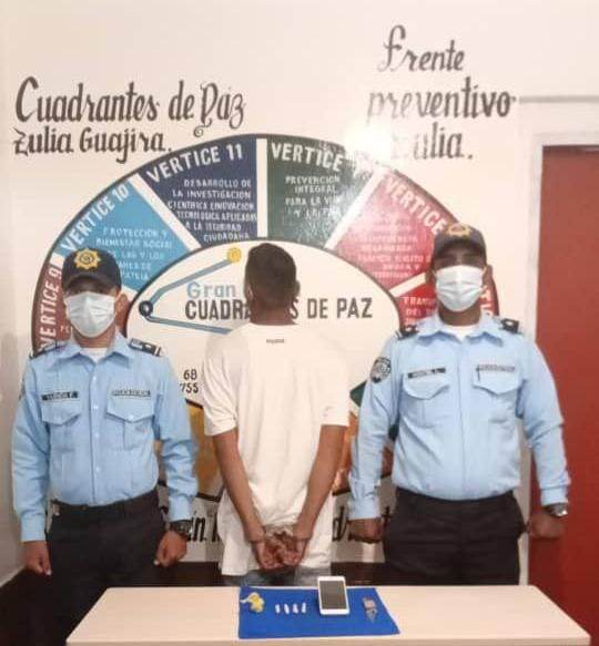 El Sinamaica, municipio Guajira, fue apresado Juan Carlos Yánez Núñez 28 años de edad, quien se movilizaba en una unidad de transporte público, al realizarle una revisión corporal, se le encontró en el calzado del pie derecho cuatro envoltorios tipo pitillos, con restos vegetales de presunta marihuana, de igual manera llevaba en el cinto del pantalón una navaja.