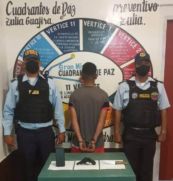 Oficiales del Centro de Coordinación Policial Indígena Guajira, capturaron a Robert Antonio Rojas Duno de 24 años de edad, en el sector San Rafael de Paraguachon, del municipio Guajira, quien portaba arma blanca y otra de fuego, según lo informó el C/J Sergio Villasmil director general del Cuerpo de Policía del estado Zulia (Cpez).
