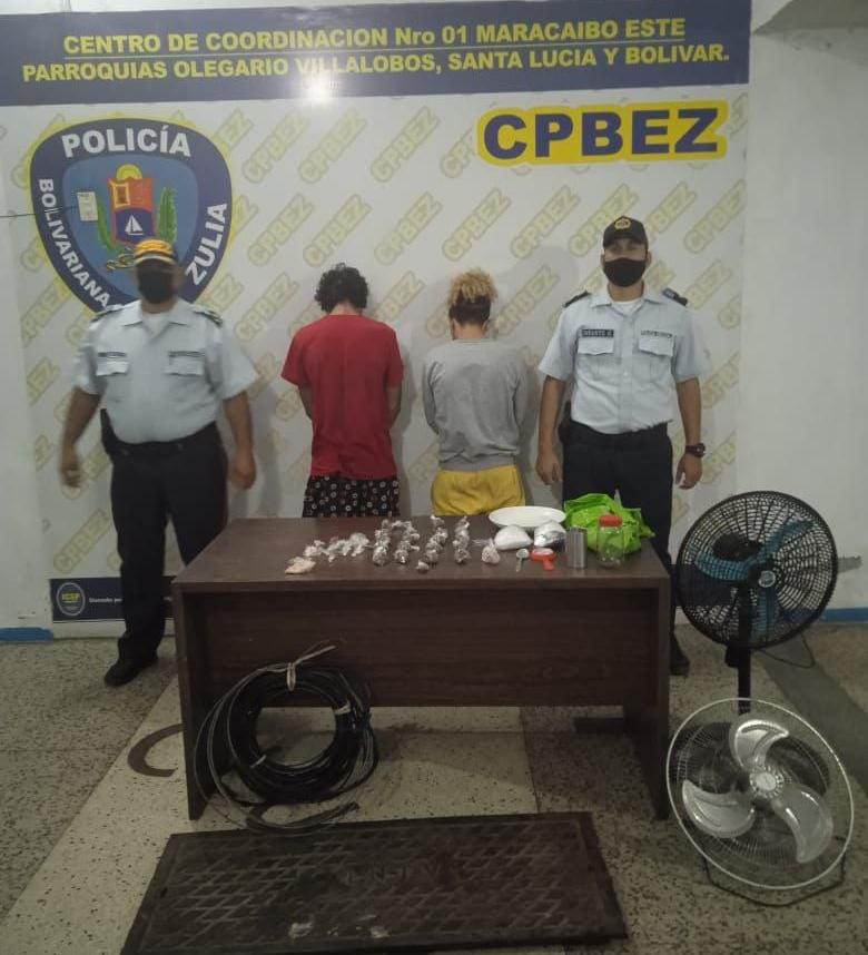 El el arresto se registró en la calle 72 con Bella Vista, parroquia Bolívar, municipio Maracaibo, donde se encontraban los delincuentes, quienes ante la presencia policial tomaron una actitud agresiva, una vez controlada la situación, al realizarles la inspección corporal se les incautó, 14 envoltorios presunto crack en polvo con 12.94 gramos, un envoltorio con tres piedras de la misma sustancia con un peso de 58.80 gramos, así como 21 envoltorios con resto vegetal presunta marihuana con un peso de 174.32 gramos, también se les incautó dos ventiladores, un rollo de guayas y una tapa de alcantarilla propiedad de Cantv, por lo que fueron aprehendidos de inmediato.