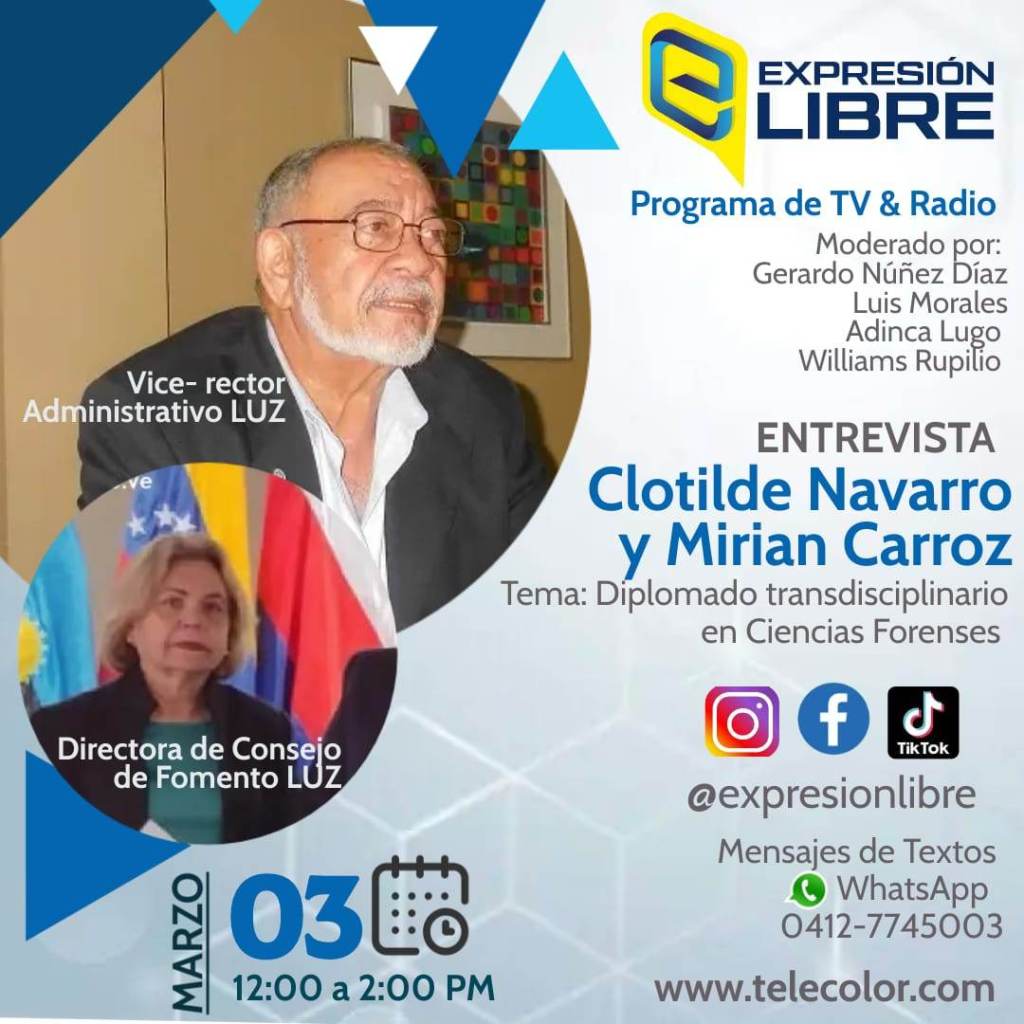 Éste viernes 03 de marzo a partir de las 12 del mediodía… tienes una cita con la información…en tu programa «Expresión Libre»…hemos invitado al Vice-Rector de LUZ Clotilde Navarro y la Directora de Fomento de LUZ Mirian Carroz …a través de Telecolor… canales 41 señal abierta…8 Intercable…134 Netuno y Cable Tiuna 85…Maxicable canal 19… Streaming: http://www.telecolor.com …nuestras redes sociales…Instagram @expresionlibretv … Facebook: Expresión Libre… Twitter: @expresionmcbo y Canal Telegram: Expresión Libre TV…descarga en tu teléfono inteligente… Tablet… Laptop o PC la Aplicación App Zeno Radio: Eclipse 101.7 FM la popular…tus mensajes de texto o WhatsApp por el 0412-7745003… «Expresión Libre»… moderado por Gerardo Núñez Díaz…Luis Morales Bracho…Adinca Lugo Díaz y William Rupilio González Bermúdez…