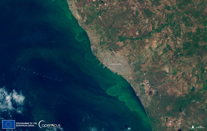 “El 24 de febrero Sentinel 2 mostró múltiples floraciones de algas en remolino frente a la costa de Ciudad Ojeda, en el lago de Maracaibo”, dice el texto en la cuenta oficial de la Unión Europea en Venezuela.