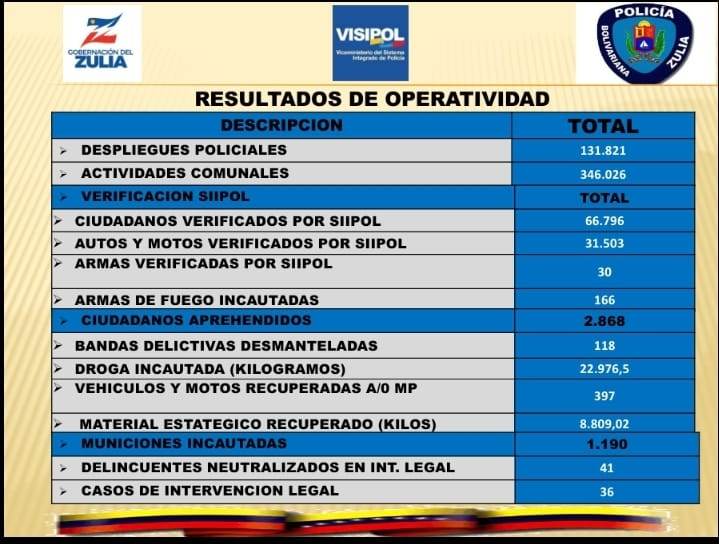 Este redimensionamiento de la estructura policial permitió 131.821 despliegues policiales, 346.026 actividades comunales, 118 bandas delictivas desmanteladas, 22.976,5 kg de droga incautada, 166 armas de fuego incautadas, 397 vehículos puestos a la orden del Ministerio Público, 8.809,02 kg de material estratégico recuperado, 41 delincuentes neutralizados en 36 casos de intervención legal, todo esto en los 25 corredores viales, cuatro troncales seguras y dos cuadrantes rurales, lo que permitió al Cpez ocupar el tercer lugar en efectividad operacional a nivel nacional.