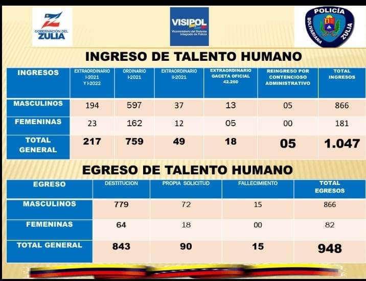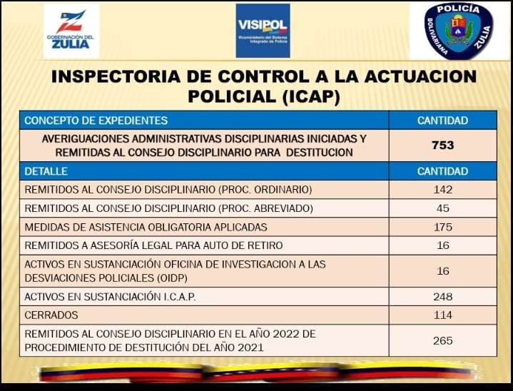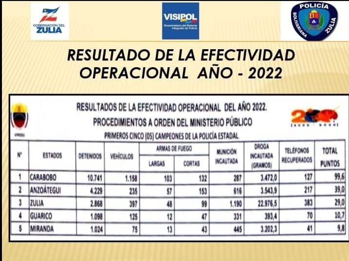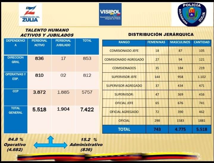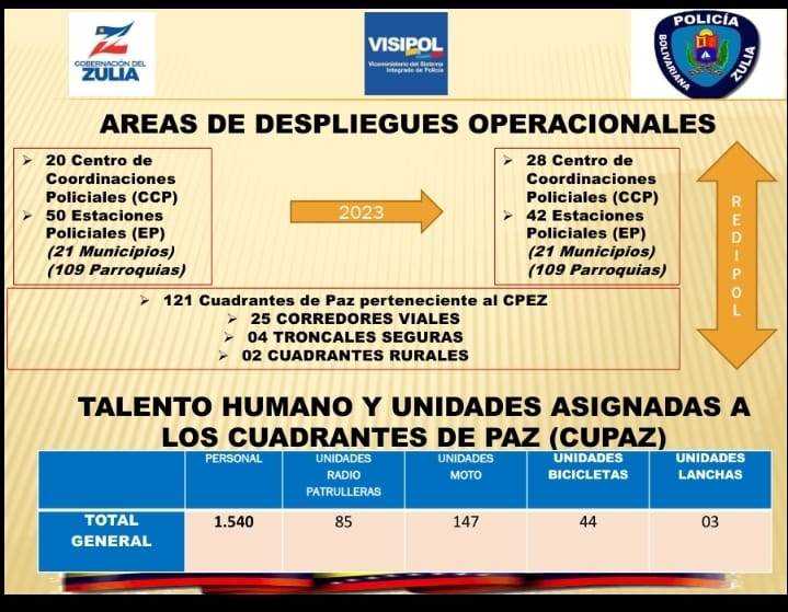 «En cuanto a las áreas de despliegues operacionales pasamos de 16 Centros de Coordinación Policial (CCP) a 20 con 50 Estaciones Policiales distribuidos en los 21 municipios y 109 parroquias del Zulia, teniendo como meta para el 2023 llegar a 28 CCP, esto permitirá mayor cercanía y respuesta policial» detalló Villasmil.