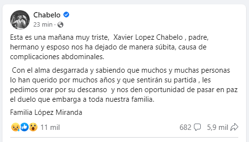 “Esta es una mañana muy triste, Xavier López Chabelo, padre, hermano y esposo nos ha dejado de manera súbita, causa de complicaciones abdominales. Con el alma desgarrada y sabiendo que muchos y muchas personas lo han querido por muchos años y que sentirán su partida, les pedimos orar por su descanso y nos den oportunidad de pasar en paz el duelo que embarga a toda nuestra familia. Familia López Miranda”, confirmaron en su cuenta oficial de Twitter.