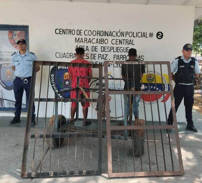 Patrulleros del Cuerpo de Policía del estado Zulia (Cpez) adscritos al Centro de Coordinación Policial Maracaibo Central, durante un recorrido preventivo por la avenida 16 Guajira a la altura del Rectorado de la Universidad del Zulia, parroquia Chiquinquirá, municipio Maracaibo, aprehendieron a dos sujetos, quienes llevaban en una carreta dos rejillas del desagüe de la ciudad.