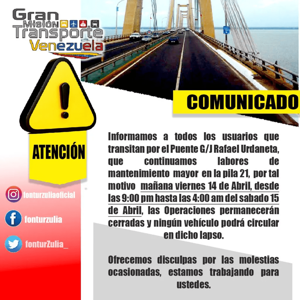Informamos a todos los usuarios que transitan por el Puente G/J Rafael Urdaneta, que debido a labores de mantenimiento en la Pila 21 mañana 𝐕𝐈𝐄𝐑𝐍𝐄𝐒 𝟏𝟒 𝐝𝐞 𝐀𝐁𝐑𝐈𝐋 𝐝𝐞𝐬𝐝𝐞 𝐥𝐚𝐬 𝟗:𝟎𝟎 𝐏𝐌 𝐡𝐚𝐬𝐭𝐚 𝐥𝐚𝐬 𝟒:𝟎𝟎 𝐀𝐌 𝐝𝐞𝐥 𝐒Á𝐁𝐀𝐃𝐎 𝟏𝟓 𝐝𝐞 𝐀𝐁𝐑𝐈𝐋 𝐥𝐚𝐬 𝐨𝐩𝐞𝐫𝐚𝐜𝐢𝐨𝐧𝐞𝐬 𝐬𝐞 𝐞𝐧𝐜𝐨𝐧𝐭𝐫𝐚𝐫𝐚𝐧 𝐜𝐞𝐫𝐫𝐚𝐝𝐚𝐬 y ningún vehiculo podrá circular en dicho lapso.