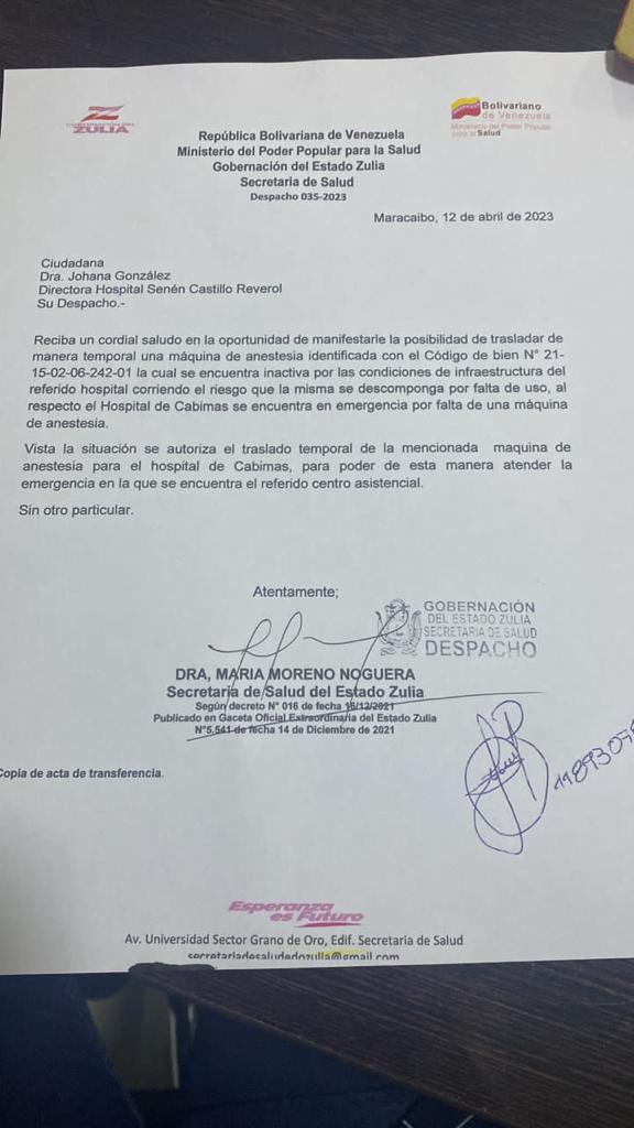 Según lo explicado por el Dr. Rubén Sánchez, el traslado temporal a Cabimas de la máquina de anestesia, la cuál esta infuncional desde hace más de ocho por la actual situación del hospital Santaritense habría sido aprobado por la Directora Regional de Salud la Dra. María Moreno quien mediante un oficio lo calificó como Plan Temporal de Contingencia para salvar la vida y resguardo de la integridad de los pacientes de la Costa Oriental del Lago.