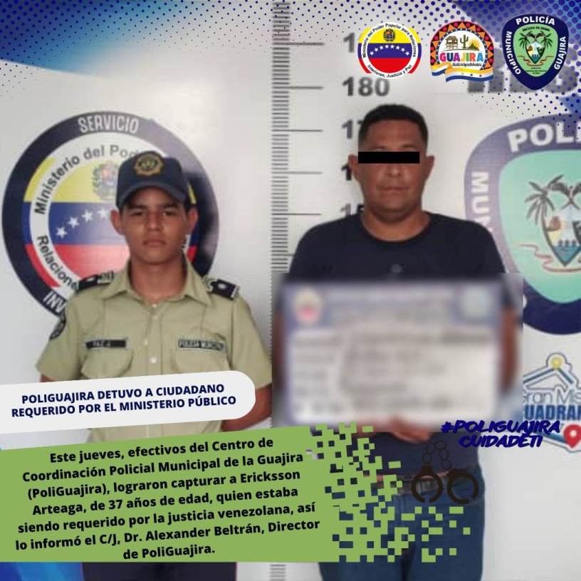 Este jueves, efectivos del Centro de Coordinación Policial Municipal de la Guajira (PoliGuajira), lograron capturar a Ericksson Arteaga, de 37 años de edad, quien estaba siendo requerido por la justicia venezolana, así lo informó el C/J, Dr. Alexander Beltrán, Director de PoliGuajira.