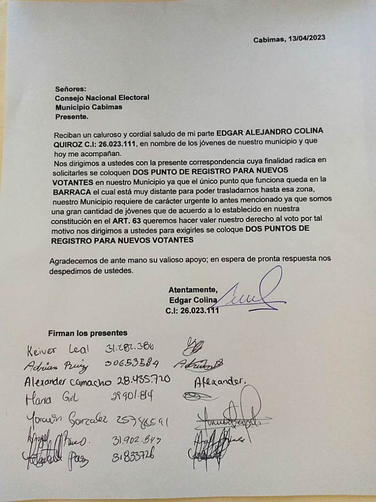 Ante ello, un grupo de jóvenes encabezados por Edgar Colina y Yorwin González, solicitó en la oficina del CNE dispuesta en el municipio Cabimas, que sean instaladas por lo menos dos máquinas del CNE, ya que son necesarias para la inscripción de los nuevos votantes, ya que a muchos se les dificulta ir hacia otras entidades para formalizar dicho trámite.