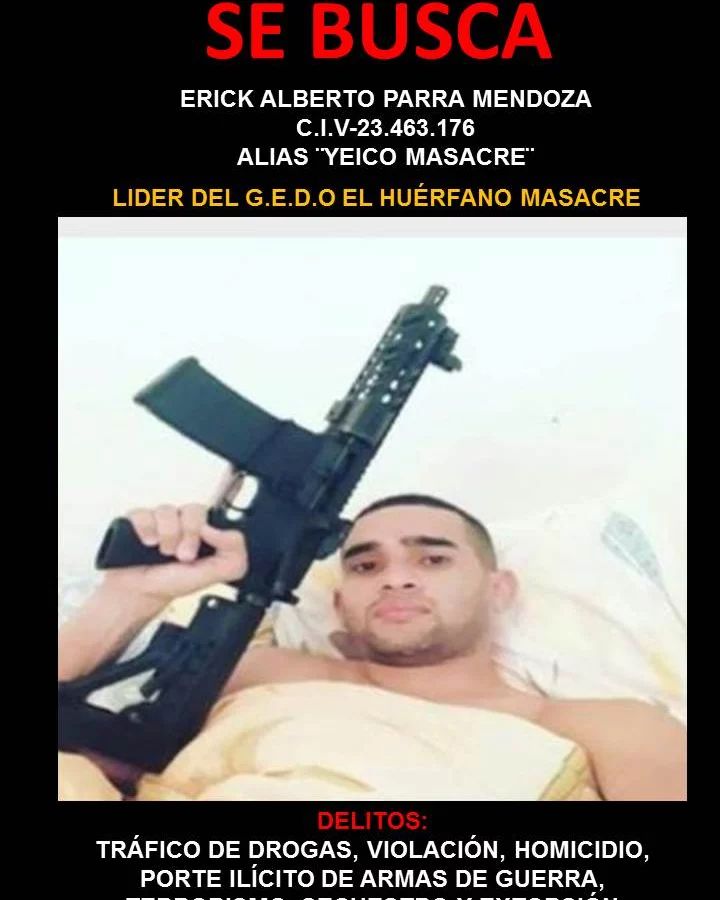 Todos los procedimientos fueron puestos a la orden del Ministerio Público. Continúan las labores de búsqueda para aprehender a los siguientes antisociales Erick Alberto Parra Mendoza (alias Yeico Masacre) Líder negativo de la Banda, Jesús Ignacio Betancourt Pimentel, (alias El Huérfano Masacre), Edimar Martínez (alias La Negra).