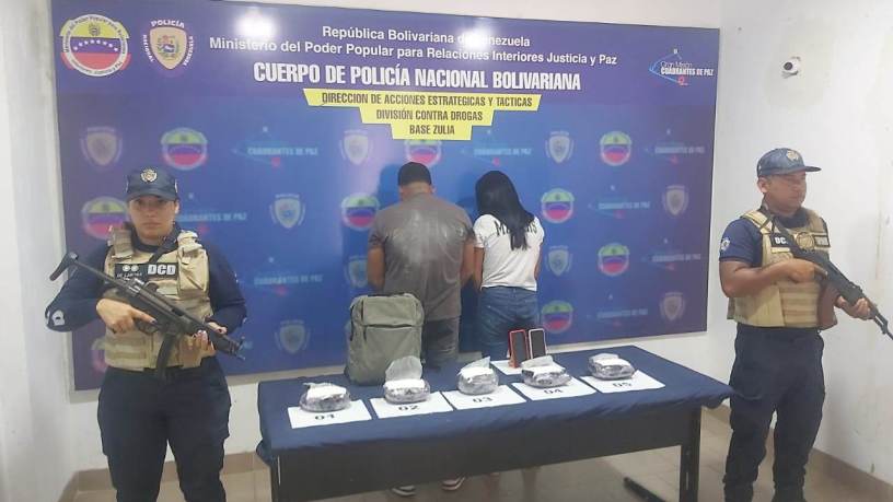 Tras labores de investigación, una comisión de la Dirección Estratégica y Táctica (Direccion Contra Droga), adscrita a la Redip Occidental de la Policía Nacional Bolivariana, capturaron en flagrancia a los ciudadanos Carlos Arturo Calle González y Rafaliangy Gómez Andrade, por posesión y comercialización de sustancias estupefacientes y psicotrópicas, luego de incautarles un poco más de cinco kilogramos de presunta cocaína.