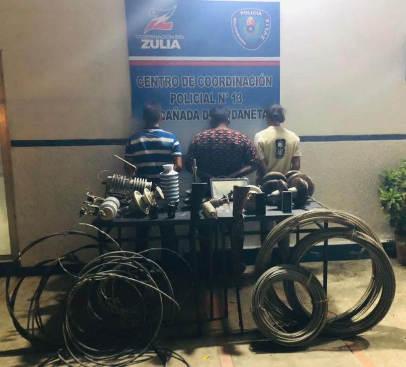 Los primeros tres delincuentes fueron atrapados en el sector Caquetillo de la Cañada de Urdaneta, quienes tenían en una zona boscosa dentro de una vivienda rudimentaria, dos corta corriente, seis aisladores, cuatro rollos de cables, un para rayo, un reflector y dos armas de fuego tipo escopetas.