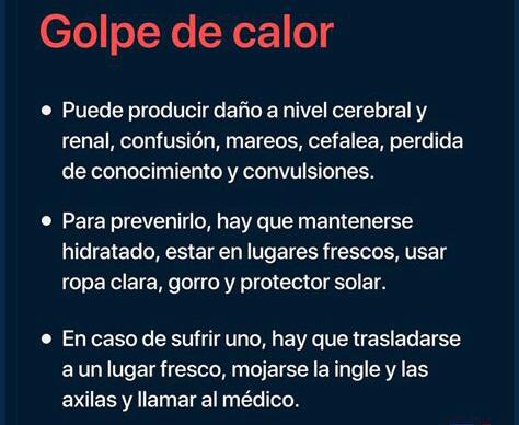 El golpe de calor, requiere tratamiento de urgencia, ya que sin tratarse puede dañar rápidamente el cerebro, el corazón, los riñones y los músculos, lo que aumenta el riesgo de sufrir complicaciones graves o la muerte.