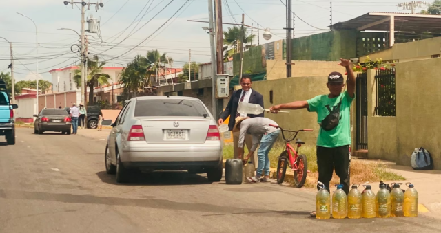 Un hombre de cabello cenizo mira de un lado al otro en la calle 43 de Maracaibo, parado con aparente nerviosismo en la parte trasera de su carro, mientras un joven se apresura a verter 5 litros de gasolina en su tanque desde un recipiente transparente.