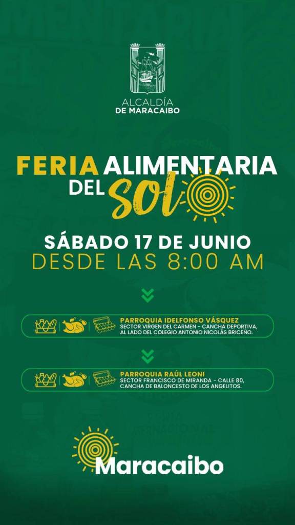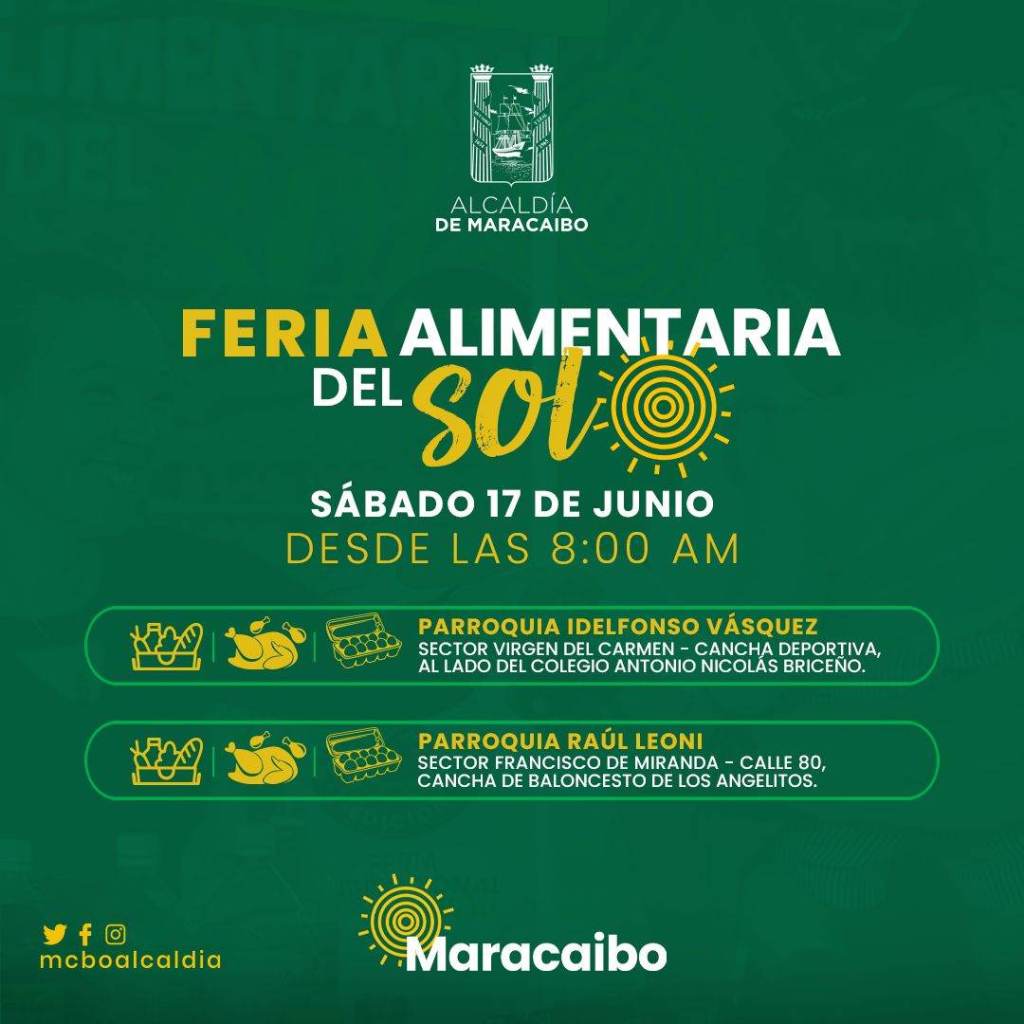 La Alcaldía de Maracaibo, a través de la Dirección de Alimentación y el Fondo para la Economía Popular (Fundepo), en alianza con el sector privado llevará, este sábado 17 de junio, la Feria Alimentaria del Sol a las parroquias Idelfonso Vásquez y Raúl Leoni, a partir de las 8:00 de la mañana.