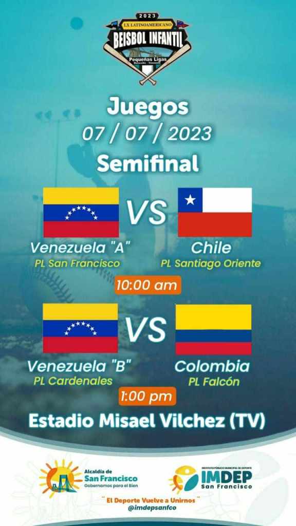 Las semifinales se jugarán este viernes en el estadio Misael Vilchez de San Francisco. A las 10:00 Venezuela » A» se medirá a la Liga Santiago Oriente de Chile. Seguidamente Venezuela » B» chocará contra PL Falcón de Colombia
