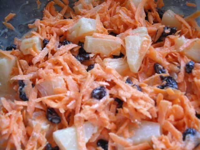 Colocar todas las frutas picadas en el tazón con el yogur. Agregar las nueces y las pasas. Añadir el plátano en rodajas, revolver de inmediato con una cuchara para evitar que se oxide.