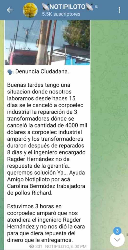 «La clase obrera de Corpoelec zulia rechaza las acciones inescrupulosas de los ingenieros Richard Urdaneta y Andrés Nova quienes manejan los cambios de transformadores residenciales y privadas utilizando a empresas privadas reparadoras de transformadores entre ellas Emelven y Vatelca para lucrarse de esta manera.