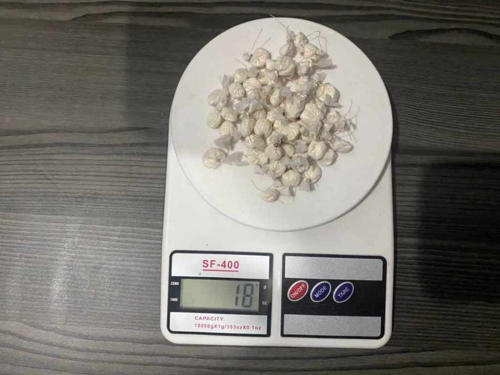 Durante el cateo se le incautó, en el bolsillo delantero derecho del shorts, 52 envoltorios de material sintético de color Blanco, atados en su único extremo con un hilo de marrón, contentivos en su interior de una sustancia de color blanco, Droga presuntamente denominada cocaína, con un peso total de 18 gramos.