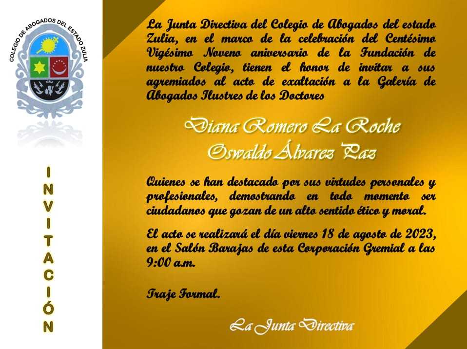 Este viernes, 18 de agosto, en el marco del vigésimo noveno aniversario, además se llevará a cabo la exaltación a la galería de abogados ilustres, a los doctores Diana Romero La Roche y Oswaldo Álvarez Paz, en el salón Barajas de la institución, en Maracaibo.