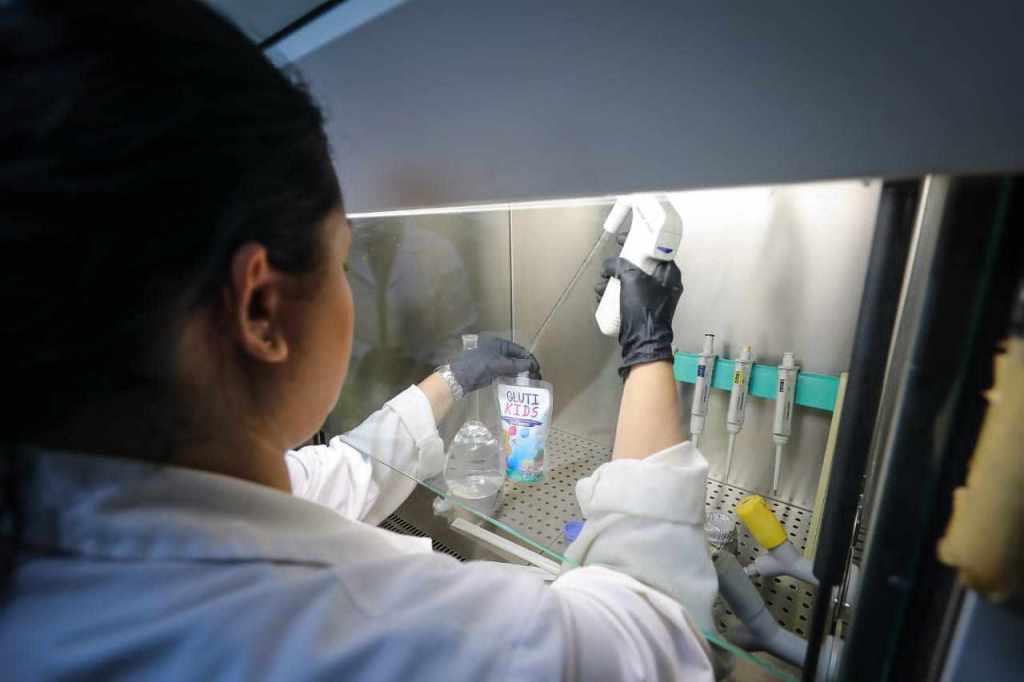 Joanna Baricelli, quien es Magister en Microbiología y profesional asociada a la investigación, del laboratorio de Fisiología Molecular del IVIC, comenta que uno de los objetivos de Glutikids es reducir la mortalidad en niños y niñas; este producto fue elaborado en el laboratorio de Fisiología Molecular y viene de un proceso químico donde el grupo de laboratorio hacemos soluciones bajo esterilidad y luego en una campana de extracción hacemos las alícuotas de esta solución de rehidratación.
