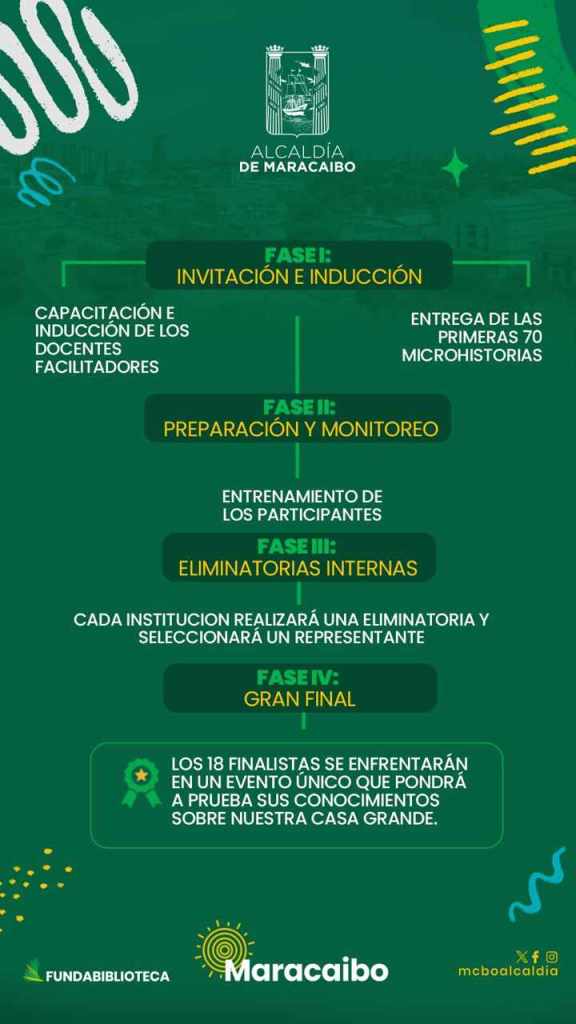 “En esta primera etapa, nuestros maestros acuden a las escuelas con la información respectiva, una vez que aceptan participar en el concurso, se dedica el tiempo para orientar a los chamos a que hagan el trabajo. Luego, para la segunda, viene la preparación y monitoreo de las unidades educativas participantes y se le entregará unas micro-historias que ellos deben leer y conocer para retar al conocimiento y asegurar su buen desempeño tanto en las eliminatorias internas, como en la gran final, y así se les refuerza la lectura y se consolidan sus conocimientos”, precisó el Alcalde.