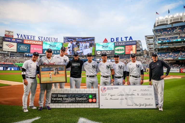 Un letrero autografiado del Yankee Stadium Subway, un cheque de 10.000 dólares para su fundación y una pintura personalizada, de un emblemático momento, fueron los regalos que ofrecieron a “Miggy”.