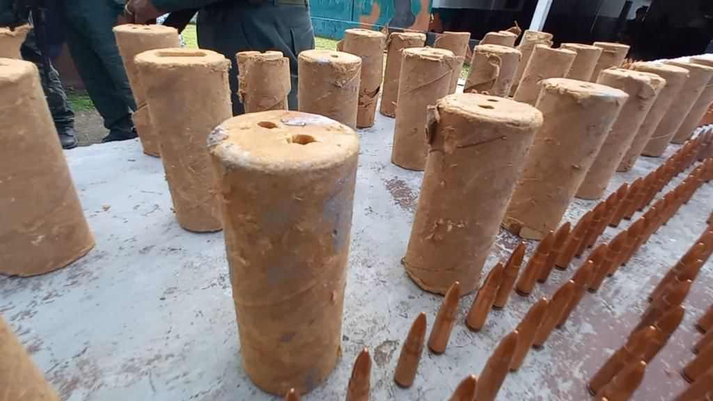 También se incautaron 55 minas, seis minas de fabricación casera, una mina de proyección, 12 espoletas eléctricas, 18 detonadores electrónicos, 24 booster de pentolita, un saco de urea de 50 kilos, una antena de Internet satelital portátil, 96 cartuchos de emulsión explosiva, tres espoletas inalámbricas, 1.063 municiones calibre 7,62x39mm, un cargador, nueve municiones cal. 9mm, un vehículo tipo moto, 100 metros de cable para explosivos, dos envases plásticos con combustible, uniformes y material de intendencia militares colombianas y documentos varios de interés criminalístico.