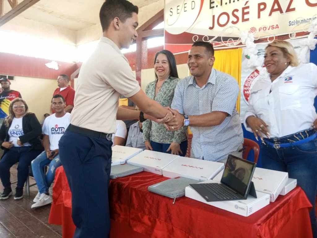 Desde la Escuela Técnica José Paz González del sector Pueblo Nuevo en la parroquia Altagracia en el municipio Miranda, se realizó el acto donde la Lcda Penélope González, Jefa de la Zona Educativa Zulia, informó, que es un orgullo ver que estos jóvenes se forman en espacios educativos que han venido recuperando gracias a la gestión del Presidente Nicolás Maduro y la Ministra del Poder Popular para la Educación Yelitze Santaella para ofrecer una educación excelente en el estado Zulia: «Esto no es más que un momento emotivo de mucho orgullo porque vemos como una camada de muchachos y muchachas se nos van de los liceos a ser carreras en toda la región Zuliana que van a fortalecer el motor productivo de nuestro país en unos cuantos años y entregarle esta herramienta tecnológica que le va facilitar los estudios universitarios; para nosotros es muy satisfactorio y un compromiso con la educación de nuestro país».