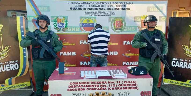 El procedimiento se llevó a cabo en el Punto de Atención al Ciudadano “Carrasquero”, ubicado en la parroquia Luís de Vicente, municipio Mara, del estado Zulia, cuando los efectivos militares de servicio se encontraban realizando labores de requisa a vehículos y personas, quienes, al observar una actitud sospechosa en el sujeto, procedieron a revisar sus pertenencias.