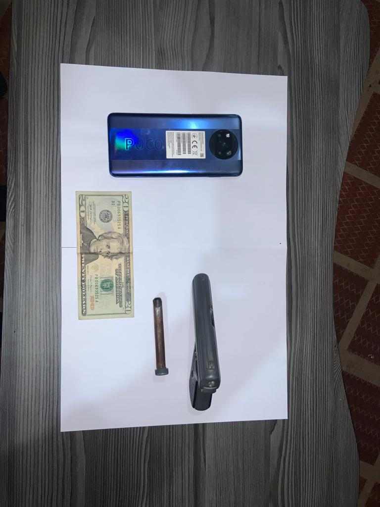 Se trasladan al sitio y al llegar observan la motocicleta y los dos sujetos que la víctima identificó y señaló como autores de los hechos, quienes al notar la presencia de la Comisión Policial intentaron huir en la motocicleta, acción que fue neutralizada rápidamente por los funcionarios, procediendo a restringirlos y realizarle su respectiva inspección corporal, lográndole incautar al conductor, un arma tipo pistola y al acompañante se le incautó de su bolsillo un teléfono celular, marca Redmi y 20 Dólares.