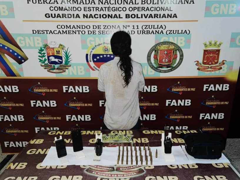 Efectivos militares del Destacamento de Seguridad Urbana del Comando de Zona N° 11 de la Guardia Nacional Bolivariana, tras intensas labores de patrullaje y escudriñamiento en el sector El Marite, parroquia Venancio Pulgar, del municipio Maracaibo, lograron la aprehensión de un sujeto a quién se le incautó dentro de un bolso tipo coala una granada de humo, 33 cartuchos sin percutir, un radio portátil y dos equipos telefónicos.