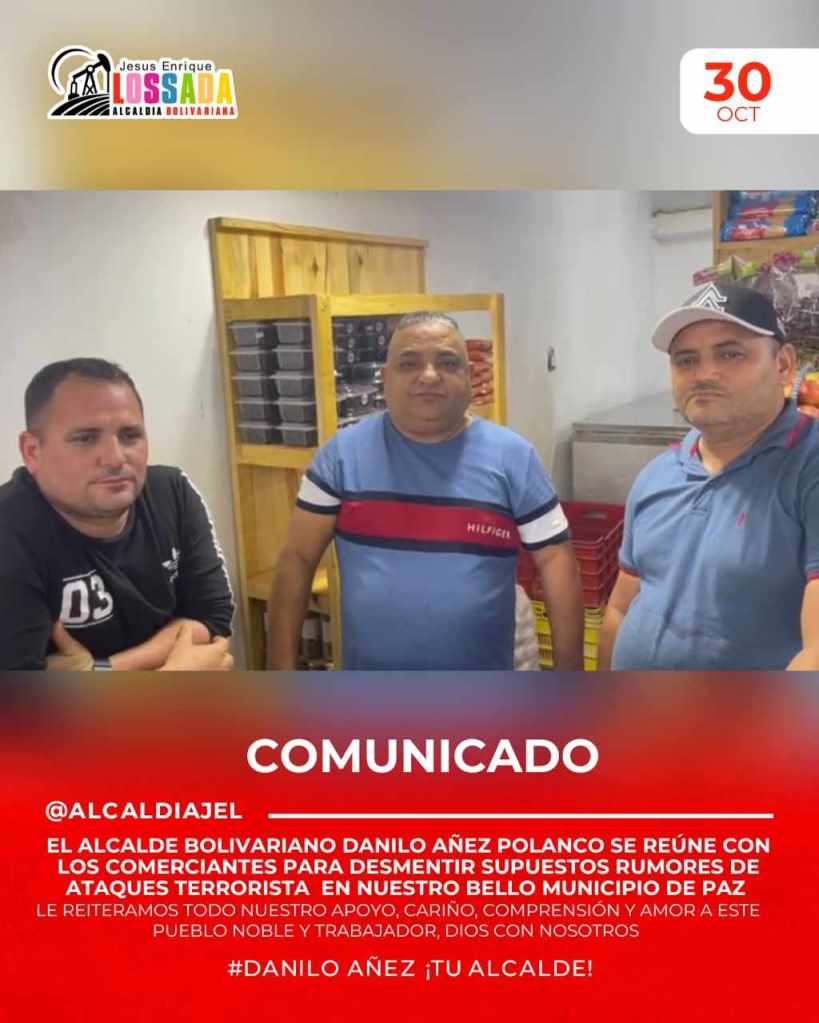 Regionales ACLARATORIA: Alcalde del Municipio Jesús Enrique Lossada Danilo Añez Polanco, desmiente supuestos ataques terroristas en La Concepción. Fecha: 30 octubre, 2023Autor/a: Crítica24 0 Comentarios Comparte esto: Compartir en X (Se abre en una ventana nueva) X Comparte en Facebook (Se abre en una ventana nueva) Facebook Compartir en LinkedIn (Se abre en una ventana nueva) LinkedIn Compartir en Telegram (Se abre en una ventana nueva) Telegram Compartir en WhatsApp (Se abre en una ventana nueva) WhatsApp Me gusta Cargando...