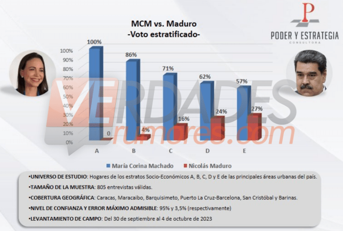 ENCUESTA. Aunque fue realizada en un período previo a la primaria presidencial, son interesantes los resultados de la última encuesta de la consultora “Poder y Estrategia”. ¿Por qué son relevantes? Porque mide la intención de voto en un escenario cerrado entre María Corina Machado versus Nicolás Maduro y en todos le gana MCM, pero sobre todo destaca como le gana abiertamente en los sectores D y E que son bastiones tradicionales del chavismo. Revisemos la información por niveles socio económicos y el porcentaje con el cual la señora Machado derrota a Nicolás: A (100%), B (86%), C (71%), D (62%) y E (57%). Esto reafirma las razones por las cuales en el chavismo están histéricos.