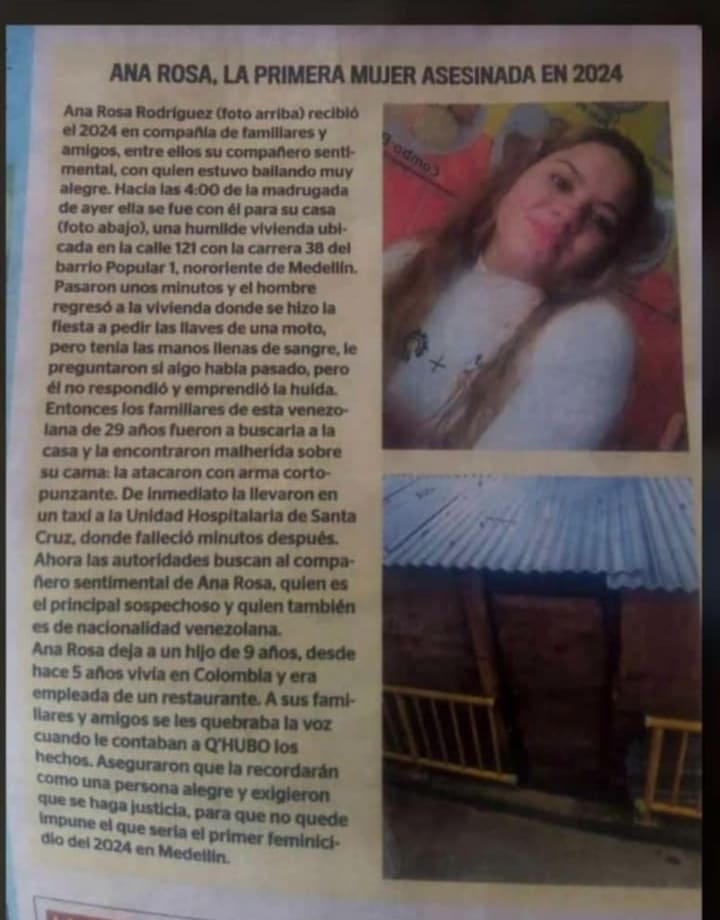Yoandri Gregorio Medina González salió huyendo la madrugada del 1 de Enero de 2024 del barrio Popular 1 de Medellín luego de haber asesinado a su pareja identificada como Ana Rosa Rodríguez (29) con un arma blanca. El hecho se produjo enfrente de su hijo de 9 años.