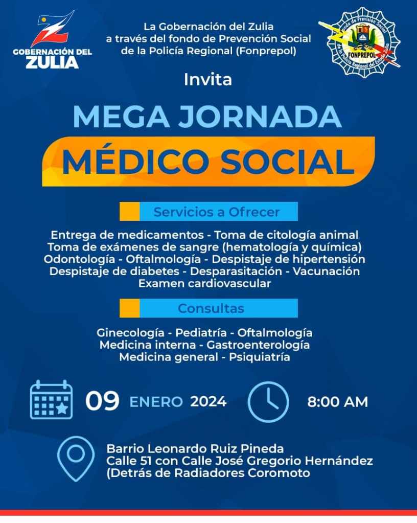 El Gobernador del estado Zulia, Manuel Rosales, a través del Fondo de Previsión Social de la Policía Regional, Fonprepol, inicia este nuevo año con el despliegue de una Mega Jornada Médico Social, este martes, 9 de enero de 2024, en la calle 51 con calle “José Gregorio Hernández”, del barrio “Leonardo Ruiz Pineda”, parroquia Coquivacoa de Maracaibo.