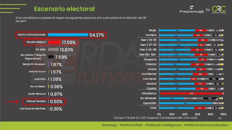 ENCUESTA. Recibo el informe de la encuesta elaborada por ORC Consultores. “Frequency58”. En el estudio fueron entrevistadas 1.125 personas entre el 11 y el 16 de marzo de 2024, con un nivel de confianza del 95%. Cuando consultan a las personas sobre cuál es el rumbo que debe tomar el país, un 74.78% indicó que es necesario cambiar hacia otra dirección, mientras apenas el 16.45% afirma que debe seguir por el mismo camino. Al medir el agrado y desagrado de los liderazgos políticos, aparecen María Corina Machado (agrado 57%-desagrado 17%), Manuel (agrado 9%-desagrado 59%) y Nicolás Maduro (agrado 18%-desagrado 64%). En relación con la intención de participar en las elecciones, un 37.93% “absolutamente sí votará”, mientras que el 6.27% “absolutamente no votará”. Cuando en el estudio indagan sobre la intención de voto, aparece María Corina Machado con el 54.27%, Nicolás Maduro con el 17.03% y Manuel Rosales con el 0.50%.