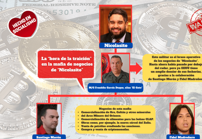 TRAICIÓN. La “hora de la traición” sigue en marcha en el oficialismo. Nadie confía en nadie. Nadie se siente 100% seguro. Y la mayoría está buscando alternativas para sobrevivir si pierden las elecciones. Lo de la doble agenda de algunos civiles y militares es una realidad que le explotó en la cara a Maduro y Jorge Rodríguez. Conocer que personajes como Tareck El Aissami y Diosdado Cabello estaban conspirando para mantenerse en un escenario post Maduro, fue una decepción terrible para Maduro, sobre todo el caso del “turco” a quien consideraba un aliado incondicional. Algo parecido está ocurriendo con su hijo Nicolás Maduro Guerra, alias “Nicolasito”, quien siente que la traición llegó a su entorno más cercano. No sólo se trata de Santiago Morón Hernández, quien al parecer permanece detenido en los calabozos de la DGCIM por negociar con Estados Unidos información de los negocios turbios de “Nicolasito”, a cambio del levantamiento de las sanciones para toda su familia, tal como lo expliqué en mi columna anterior. Durante los últimos días recibí información que me indica que la traición de otros personajes del entorno de “Nicolasito” es real. ¿Quién lo está traicionando? Pues nada más y nada menos que Fidel Madroñero. Sí, ese que sin oficio y trabajo conocido se ha convertido en multimillonario gracias a los negocios de la revolución. Sí, ese mismo que tiene una empresa productora de alimentos (Catatumbo Foods) y un equipo de fútbol (Rayo Zuliano) como sus principales lavadoras de dinero. Sí, ese mismo que tiene una página con fachada de exchange de criptomonedas (https://usdtagd.com), pero que en el fondo es un sitio para estafas. ¿Y cómo está traicionando a “Nicolasito”? Para entender de forma clara es necesario revisar el contexto. Madroñero fue uno de los tantos que recibió dinero de Tareck El Aissami y cuando este cayó en desgracia a partir de marzo de 2023, Fidel y su equipo más cercano entraron en desesperación. Los nervios fueron de tal magnitud, que luego de la renuncia de TEA al gobierno, él se reunió con su entorno y les trató de dar un mensaje de tranquilidad: “No se preocupen, porque si bien es cierto que recibí dinero de Tareck, lo hice con la plena autorización de ‘Nicolasito’ y con la aprobación de ‘El Gato’, quien es fundamental en nuestro equipo”. Ya aquí hay dos delaciones importantes. La primera, que también “Nicolasito” hizo negocios con El Aissami, pero quizás la más intrigante fue esa mención a un sujeto que apodan: “El Gato”. Cuando recibí estos detalles, de inmediato me pregunté quién era en realidad el fulano “Gato” y cuál es su rol en el entorno de negocios de “Nicolasito”. Esta duda duró por mucho tiempo y no quise mencionar a este personaje, hasta tener bien claro de quién se trataba en realidad. El tema del “Gato” reflota a raíz de la detención de Santiago Morón, porque esta captura de nuevo puso nervioso a Fidel y por esto sostuvo varias reuniones con su grupo: “Tenemos que estar tranquilos. No sólo porque tenemos la protección de ‘Nicolasito’, sino también de ‘El Gato’. Pero además hay un plan ‘B’ porque los gringos tienen demasiada información en sus manos y esto podría ser un salvoconducto”. Esta información me llevó a inferir que Fidel era parte de las conversaciones de los Morón con la embajada de EEUU en Colombia, aunque no lo tengo 100% confirmado. Estos hechos recientes reactivaron el interés por saber quién es el mencionado “Gato”. Hice muchas, pero muchas consultas hasta que pude llegar a la verdad. Este personaje que tiene tanto poder en el entorno de negocios de “Nicolasito” es el mayor general (GNB), Franklin Horacio García Duque, a quien apodan el “Gato”. ¿Qué rol tiene? Pues este alto oficial de la GNB es una especie de brazo operativo de los negocios turbios con la comercialización de Oro y Coltán, entre otros minerales costosos, que se explotan “ilegalmente” en el Arco Minero del Orinoco y que le genera mil millonarias ganancias a Maduro y su hijo. Además, es parte fundamental en la compra de alimentos para las bolsas Clap, entre otras menudencias del portafolio de negocios turbios de “Nicolasito”. Importante destacar que este mayor general se encuentra sancionado por Estados Unidos desde 2017, pero no por sus andanzas en actos de corrupción, sino porque fue director de la Policía Nacional Bolivariana y comandante de la Región Estratégica de Defensa Integral Occidental de las Fuerzas Armadas Nacionales (REDI-Occidente), pero ahora gracias a la delación que se puso en marcha los gringos tienen plenamente identificado a este operador de “Nicolasito”. Gracias a Fidel y su incontinencia verbal pude conocer este alias de “El Gato”, además de entender que es una pieza clave del entramado de corrupción del hijo de Maduro.