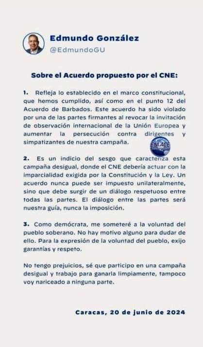 Edmundo González no firma fundamentalmente porque se vio obligado a respetar los lineamientos de María Corina quien sigue en su juego a dos bandas y Márquez, aunque seguramente él lo niega, haciendo “caritas”, simulando ahora ser crítico del gobierno, para ser el emergente ante una acción criminal del madurismo contra Edmundo González.