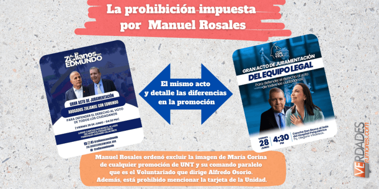 PROHIBICIÓN. Como otra muestra más del “macabro” juego de Manuel Rosales a favor de la reelección de Nicolás Maduro, es que hace pocos días prohibió cualquier mención de la tarjeta de la Unidad y la dirigencia de Un Nuevo Tiempo sólo puede mencionar la tarjeta de UNT, en su esfuerzo por promover el voto entre los ciudadanos. Su desesperación es de tal magnitud que también ordenó excluir la imagen de María Corina de cualquier posteo, video, flyer y/o imagen que sea hecha con el supuesto fin de promover el voto en el marco de la campaña electoral. Nadie puede ni siquiera hablar de ella. La mejor evidencia es la promoción a un mismo acto realizado el pasado viernes 28/06 con el fin de juramentar el equipo de abogados que defenderá el voto de los ciudadanos. En el flyer del comando regional aparece Edmundo con María Corina y toda la identidad gráfica de la campaña, mientras el flyer del Voluntariado de “Zulianos con Edmundo” aparece Rosales en primer lugar y Edmundo en un plano secundario. ¿Quieren otra evidencia del doble juego de Manuel? Pues resulta que el Voluntariado de “Zulianos con Edmundo” es su comando paralelo y no un verdadero ente autónomo que se sumó a la campaña electoral. Este comando paralelo está supuestamente liderado por el abogado Alfredo Osorio, pero la realidad es que él es sólo una fachada porque toda la dirección se hace desde UNT y con instrucciones de Manuel Rosales. La verdad es que Osorio no le presta atención a la campaña, lo que se palpa con su viaje de más de una semana a Estados Unidos con el objetivo de celebrar su cumpleaños. ¿Por qué crear este “comando paralelo”? Recordemos que Rosales hizo todos los esfuerzos a su alcance, con el fin de que lo designaran a él como jefe de campaña en el Zulia y nada le funcionó y Gustavo Ruiz siguió al frente del comando regional. Por esto crea esta especie de voluntariado que no es tan voluntario, buscando disponer de una herramienta que le permita realzar su papel en la campaña, cuando en la realidad es que está haciendo muy poco.