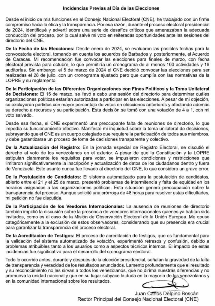 Juan Carlos Delpino, rector principal del Consejo Nacional Electoral (CNE) y de quien no se supiera nada desde la noche del 28 de julio, apuntó este lunes que en los pasados comicios presidenciales de Venezuela hubo al menos una docena de irregularidades que se tradujeron en una “falta de transparencia” y perdida de confianza en el proceso.