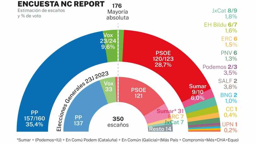 En este sentido, Vox lograría 23-24 diputados, por lo que sería suficiente para una investidura de Feijóo.