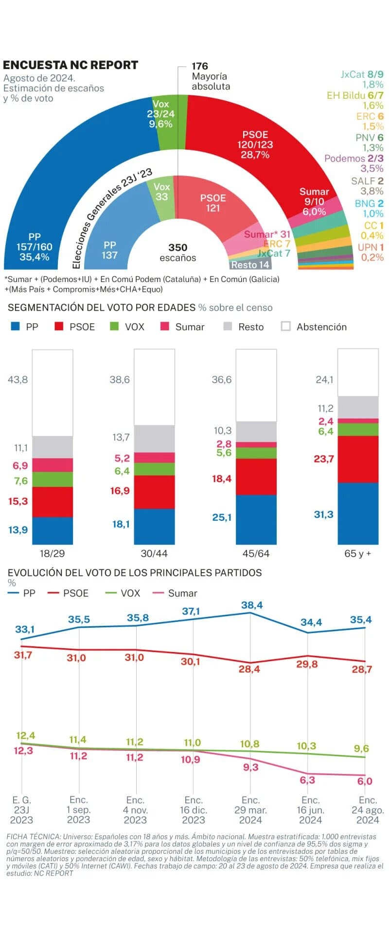 La encuesta, elaborada con 1.000 entrevistas entre el 20 y el 23 de agosto, va en la línea de las extrapolaciones que se hicieron con los resultados de las elecciones europeas, que situaban al bloque de la derecha por encima de los 180 escaños.