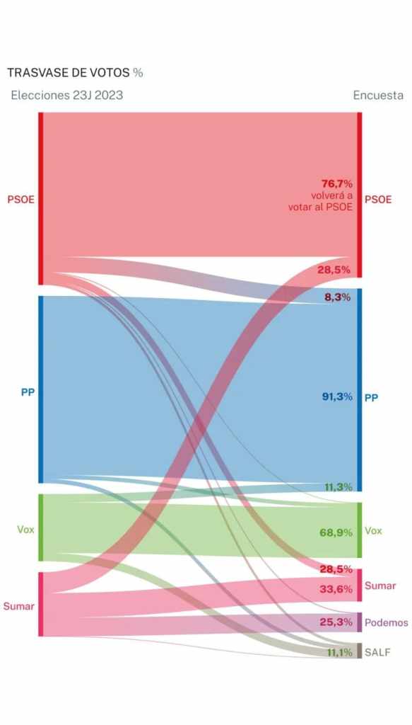 En este sentido, los socialistas, que pierden a muchos electores rumbo al PP, resisten gracias al trasvase de votantes procedentes de Sumar, ya que reciben 867.000 votos.