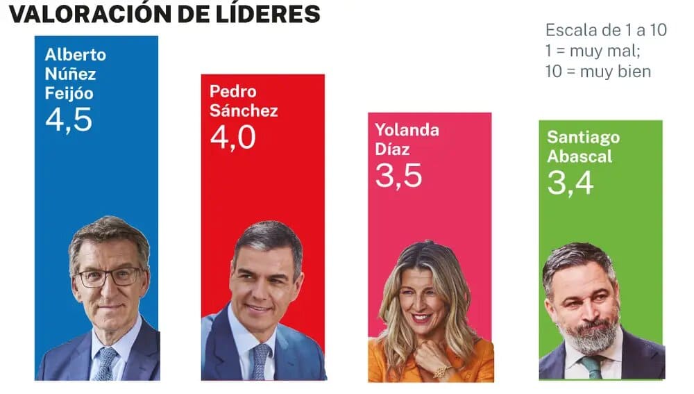Alberto Núñez Feijóo es el líder mejor valorado de la política española. En concreto, obtiene una nota de 4,5, por encima de Pedro Sánchez (4), Yolanda Díaz (3,5) y Santiago Abascal (3,4).