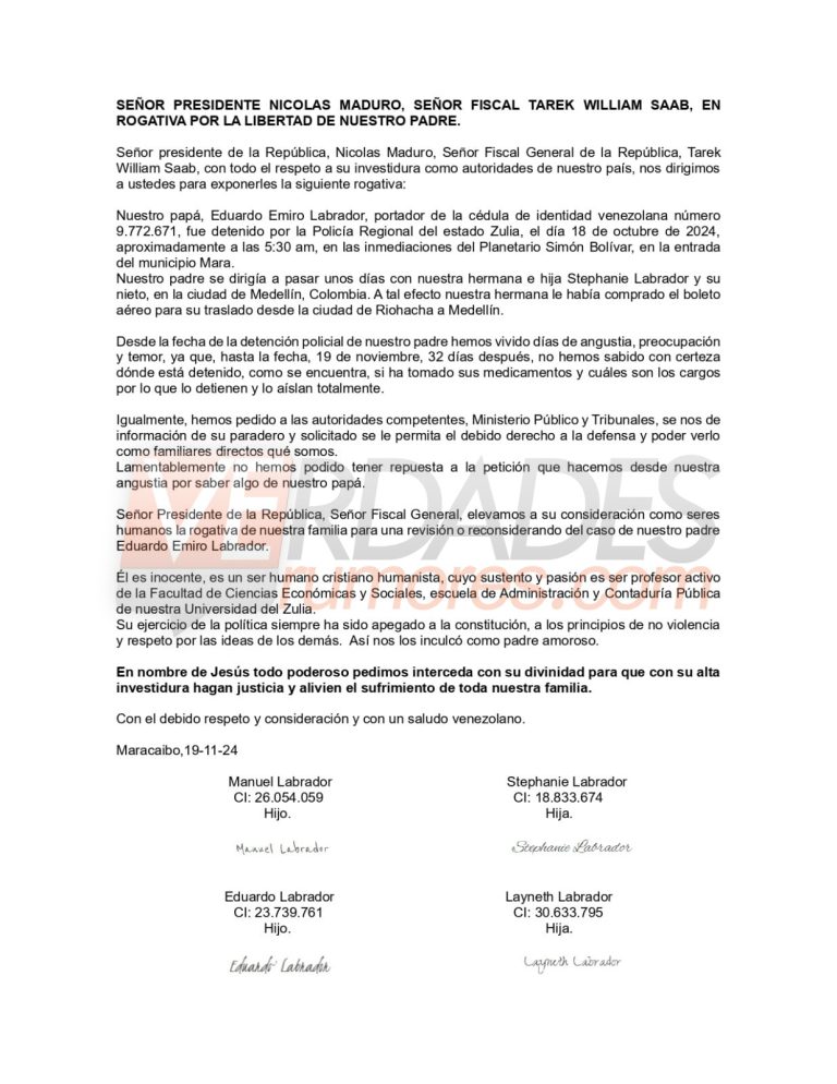 CARTA. Los hijos del legislador Eduardo Labrador difundieron una carta pública dirigida a Nicolás Maduro, con el fin de solicitar la liberación de su padre quien no sólo tiene más de 33 días detenido, sino que perversamente lo mantienen “desaparecido” y nadie sabe ni siquiera dónde está recluido.