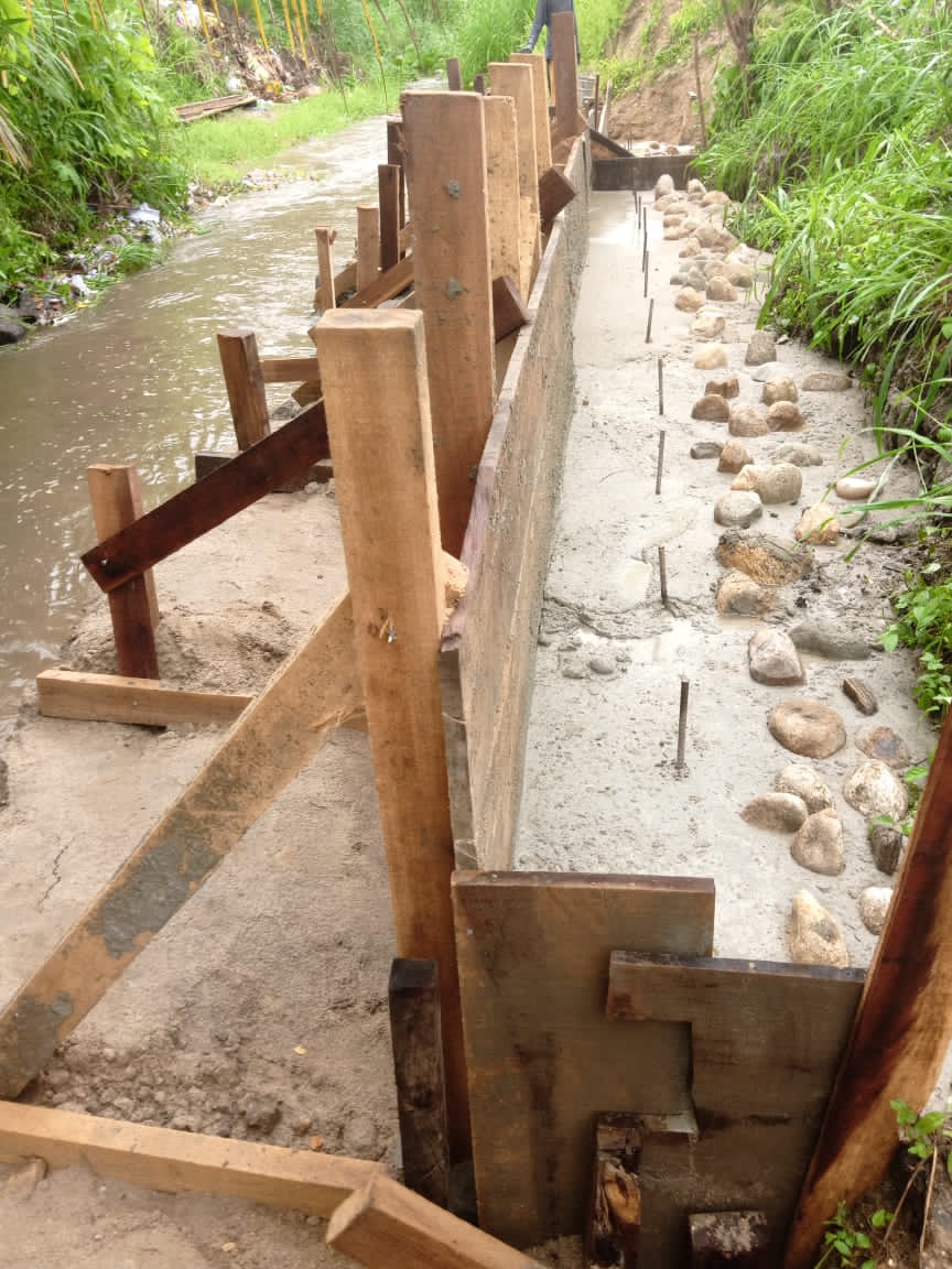 Detalló el topógrafo que la base o zapata del muro está un metro y medio por debajo del cauce natural del canal de aguas pluviales para protección y seguridad del muro, el cual está construido escalonadamente hasta llegar arriba a la orilla donde se hará un brocal de 20 centímetros sobre el nivel de asfalto, para protección de los transeúntes y vehículos.