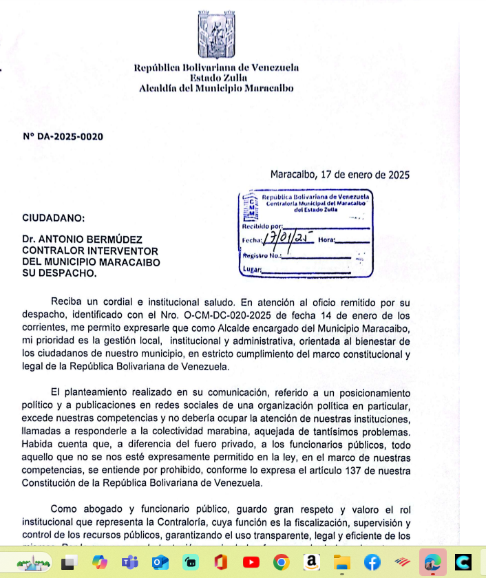Y por si fuera poco, además de la declaración pública de Omar Molina, recogida por ciertos portales de noticias, envió un oficio al Contralor Municipal de Maracaibo, Antonio Bermúdez, mediante el cual no deja dudas acerca de su reconocimiento: